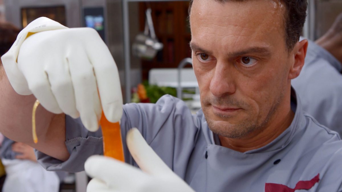 To make their showpieces, Sam pulls sugar petals while Sebastien blows a sugar flamingo.
