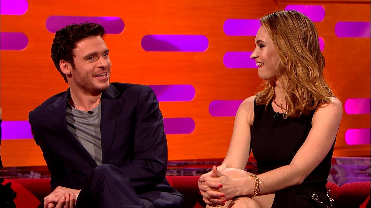 Richard Madden on the process of making sure his prince charming costume wasn't too revealing and Joan Collins talks about how the stars of the TV show Batman had the same issue