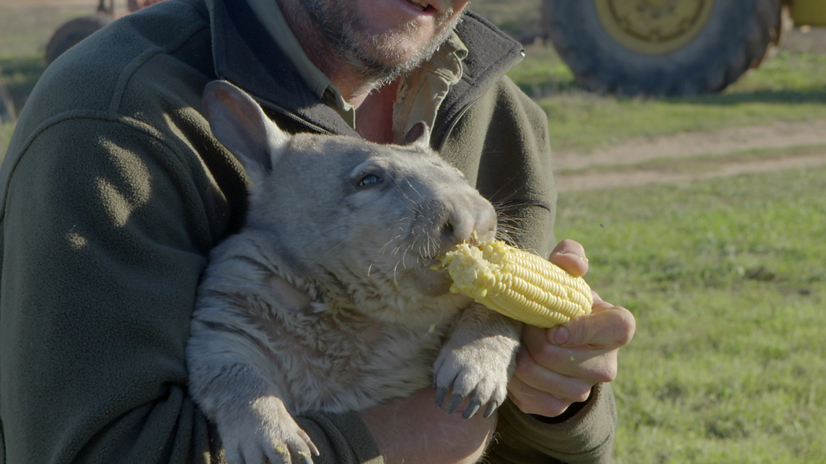 A hairy nosed wombat called Pete has his favourite snack, sweetcorn.