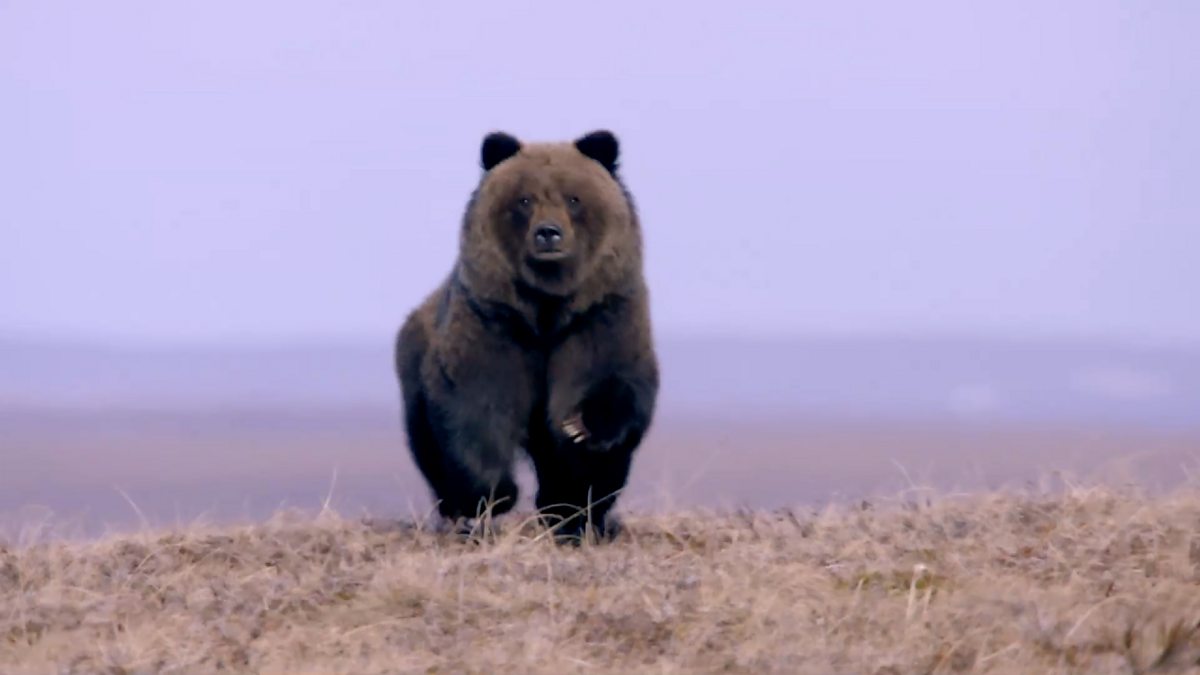 A grizzly bear stalking caribou unexpectedly turns its attention to cameraman Max Hug-Williams in a close encounter.