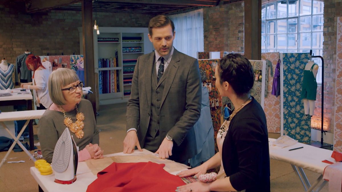 Judges Patrick Grant and Esme Young meet with Angeline to discuss her cape. They discuss whether it's a 'godette' or 'goday' going into the back panel.