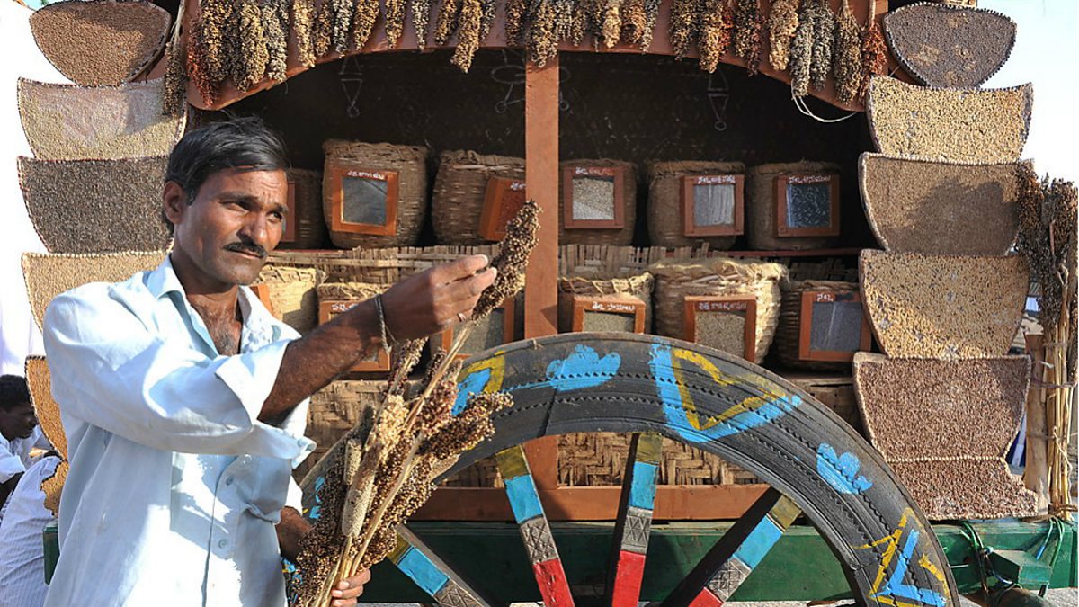 (Photo: An Indian farmer arranges a display of grains and seeds. Credit: Noah Seelam/AFP/Getty Images)