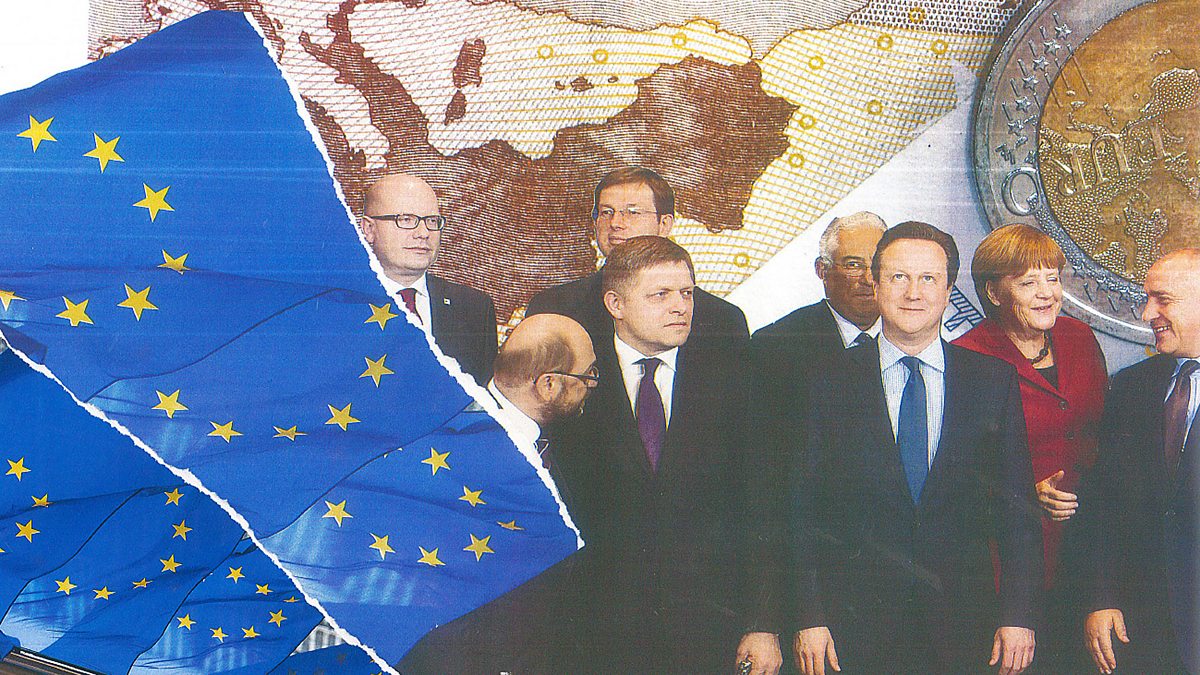 (Photo: David Cameron, Chancellor Angela Merkel, Bulgarian Prime minister Roesen Plevneliev, Eurozone finance ministers with bank notes, euro coins and a map of Europe in the background. Credit: Getty Images)
