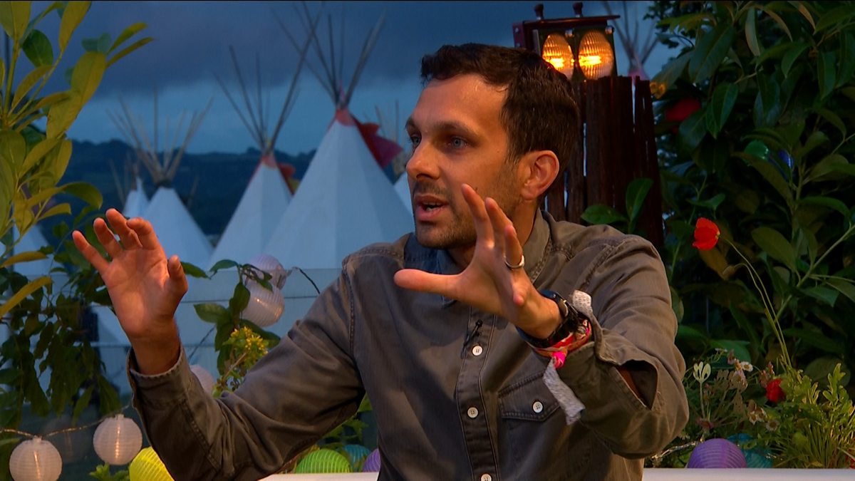 Master magician Dynamo performs some card trickery on Lauren Laverne and Huw Stephens.