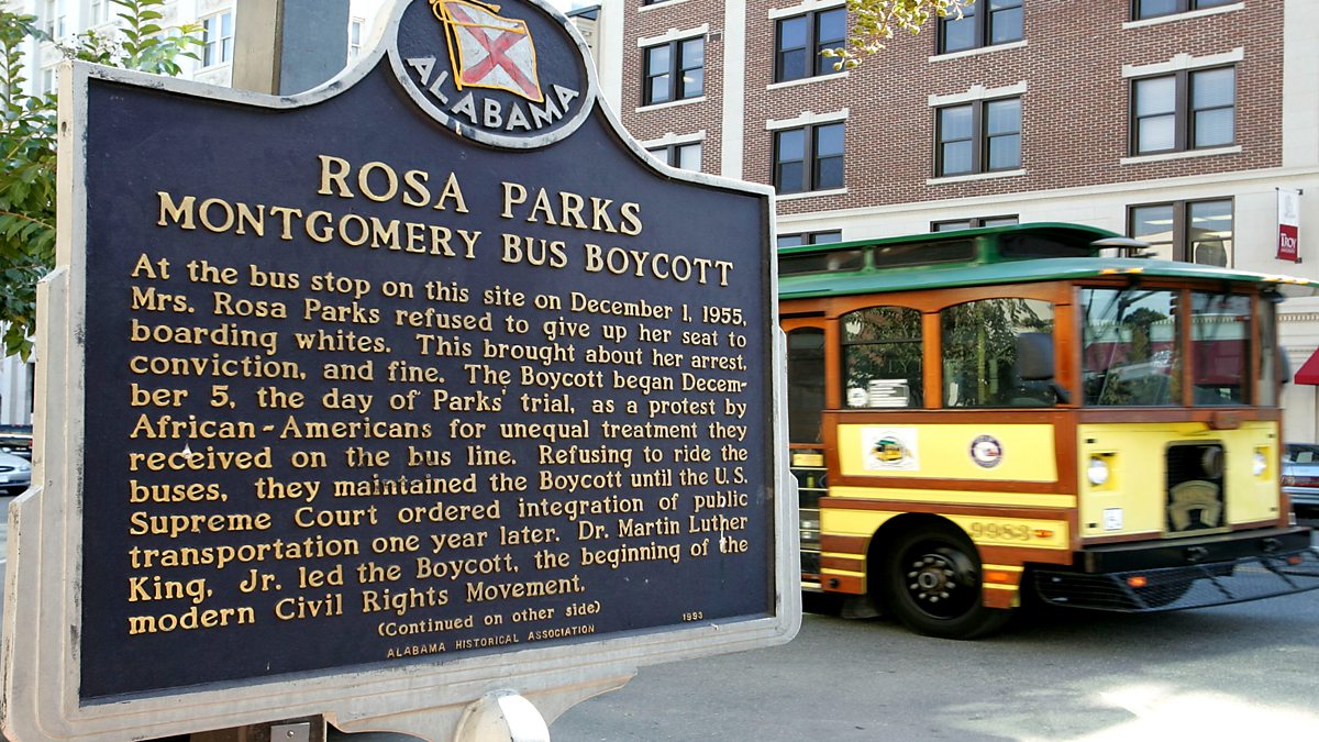 (Photo: Historic Marker at the bus stop in Alabama, USA, where Rosa Parks refused to give up her seat. Credit: Getty Images)