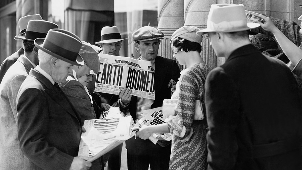 (Image - Group of people standing with one holding a newspaper with the headline "Earth Doomed". Credit - Everett Collection via Shutterstock)