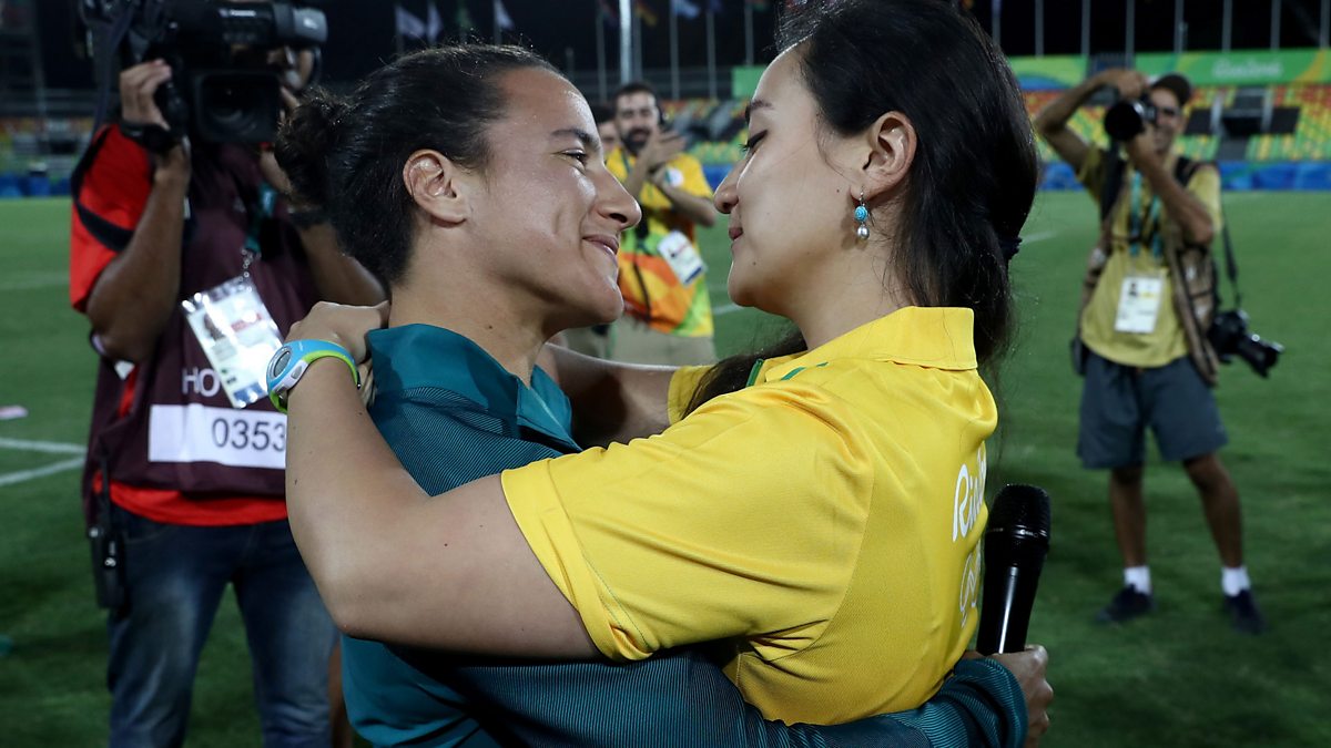 First came the medal ceremony for the winners of the first ever Olympic women's rugby sevens final. But as spectators began to leave the stadium then came another first. Marjorie Enya, a manager at the stadium, proposed to her girlfriend Isadora Cerullo, a member of the Brazilian rugby squad. We meet the couple and find out what the answer was.