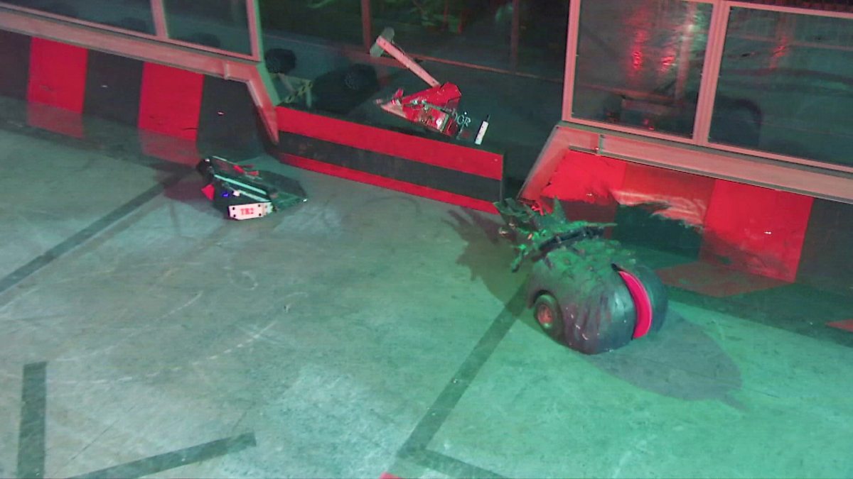 Thor gets flipped out of the arena in its head-to-head battle against TR2. Robot Wars 2016.