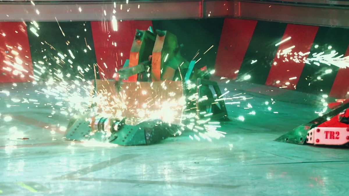 In the first group battle Pulsar takes a big hit and is showered in sparks. Robot Wars 2016.