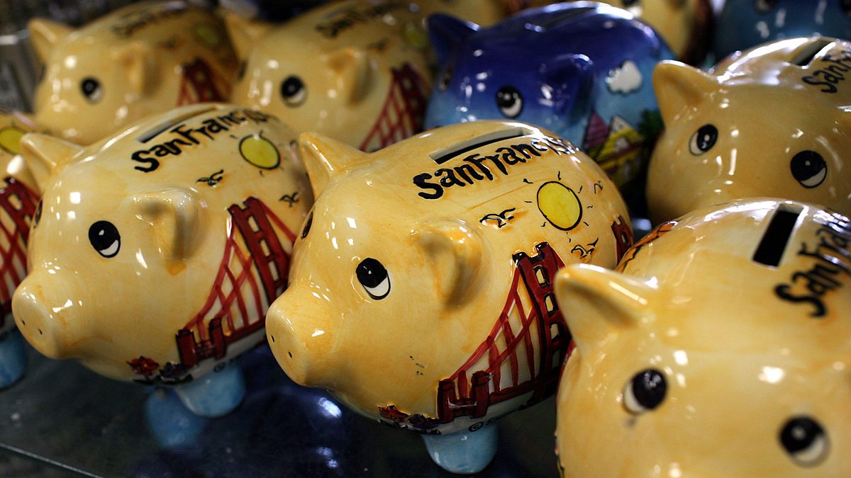 (Image: Piggy banks sit on a shelf in a store in San Francisco, California. Credit: Getty Images)