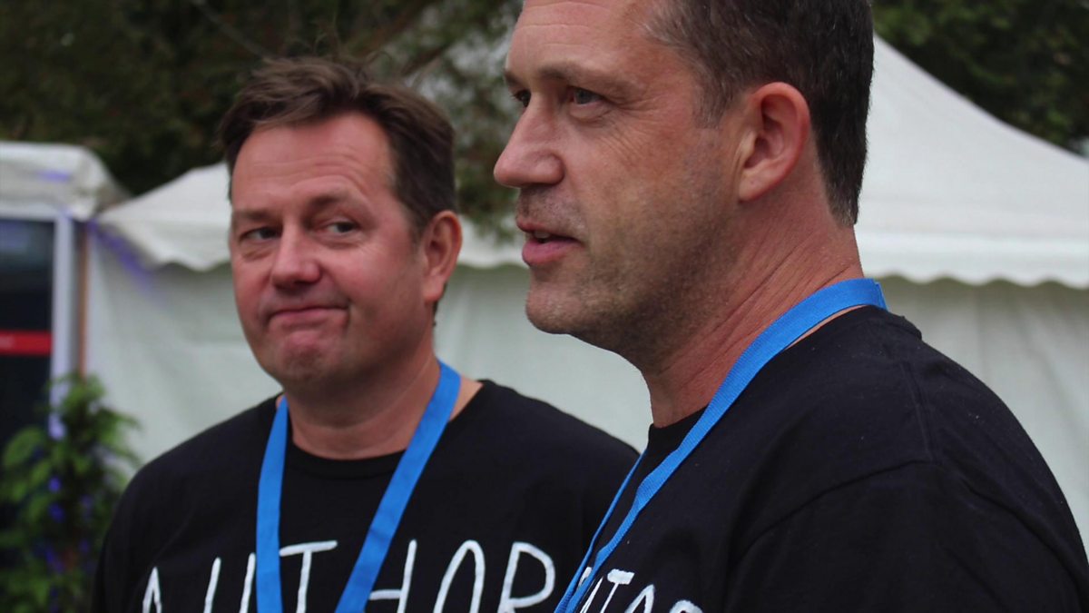 Pupils from St Peter's Primary School interview authors Chris Mould and Steve Webb.
