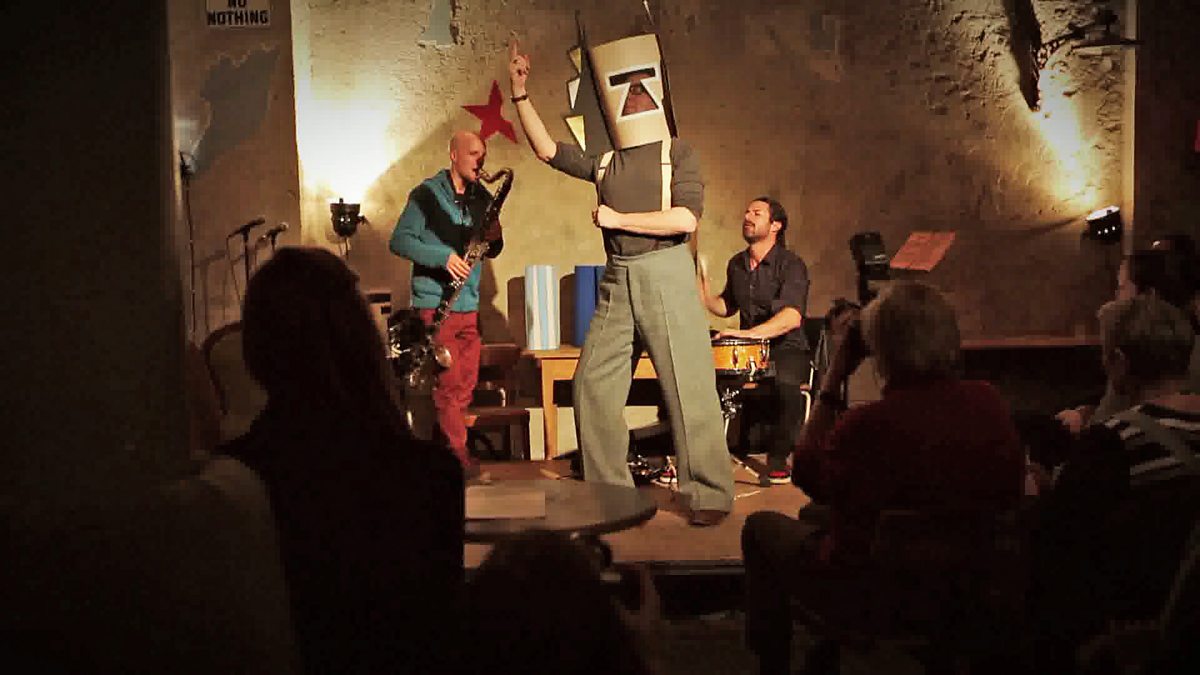 A Dada-inspired improvised dance using a replica of a Marcel Janco mask. Vic is accompanied by jazz improvisation trio Heavy Metal Rabbit - Lucien Dubuis, Barry Guy and Alfred Vogel.