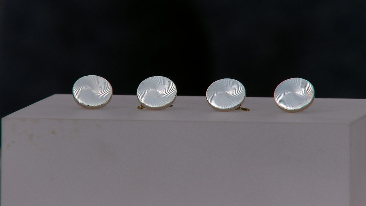 A visitor brings along a set of buttons purchased for £2.26 the day before. John Benjamin tells him he has probably made the best and fastest investment in Roadshow history.