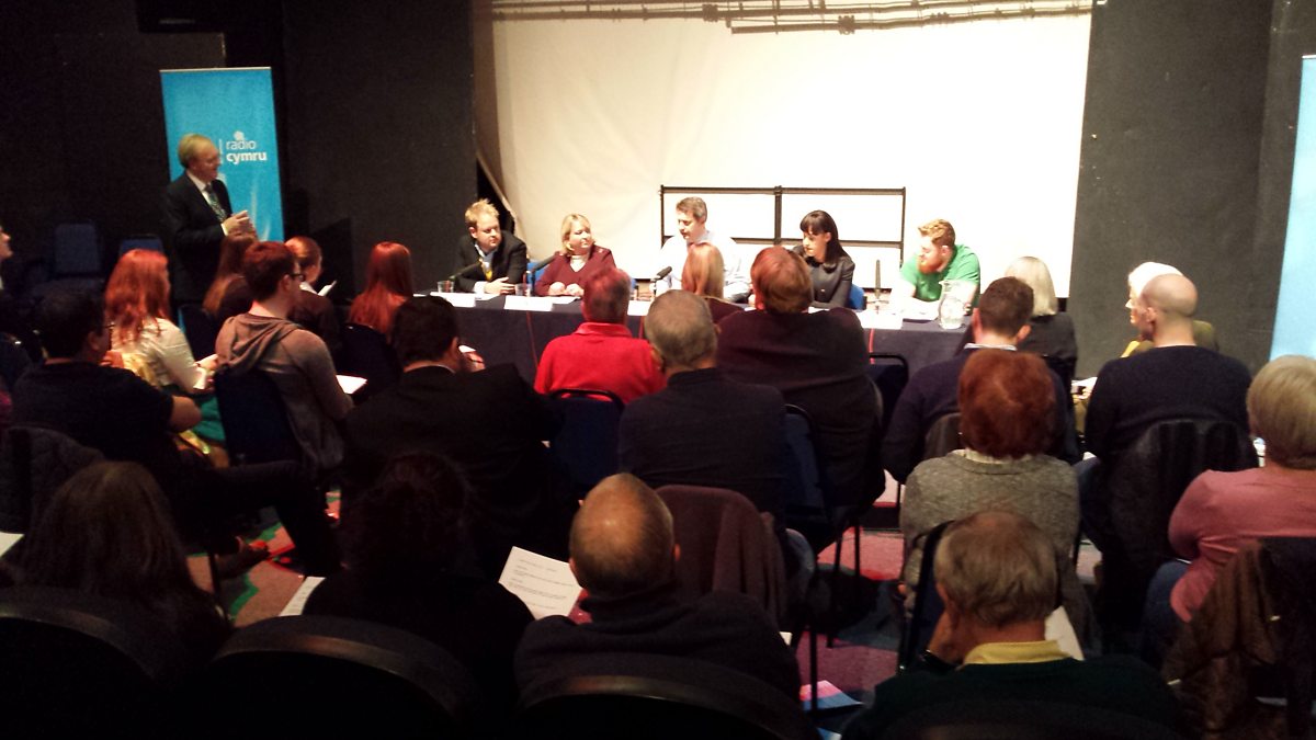 Dewi Llwyd sy'n arwain y drafodaeth wrth i bobl Llwynypia gael yr hawl i holi.