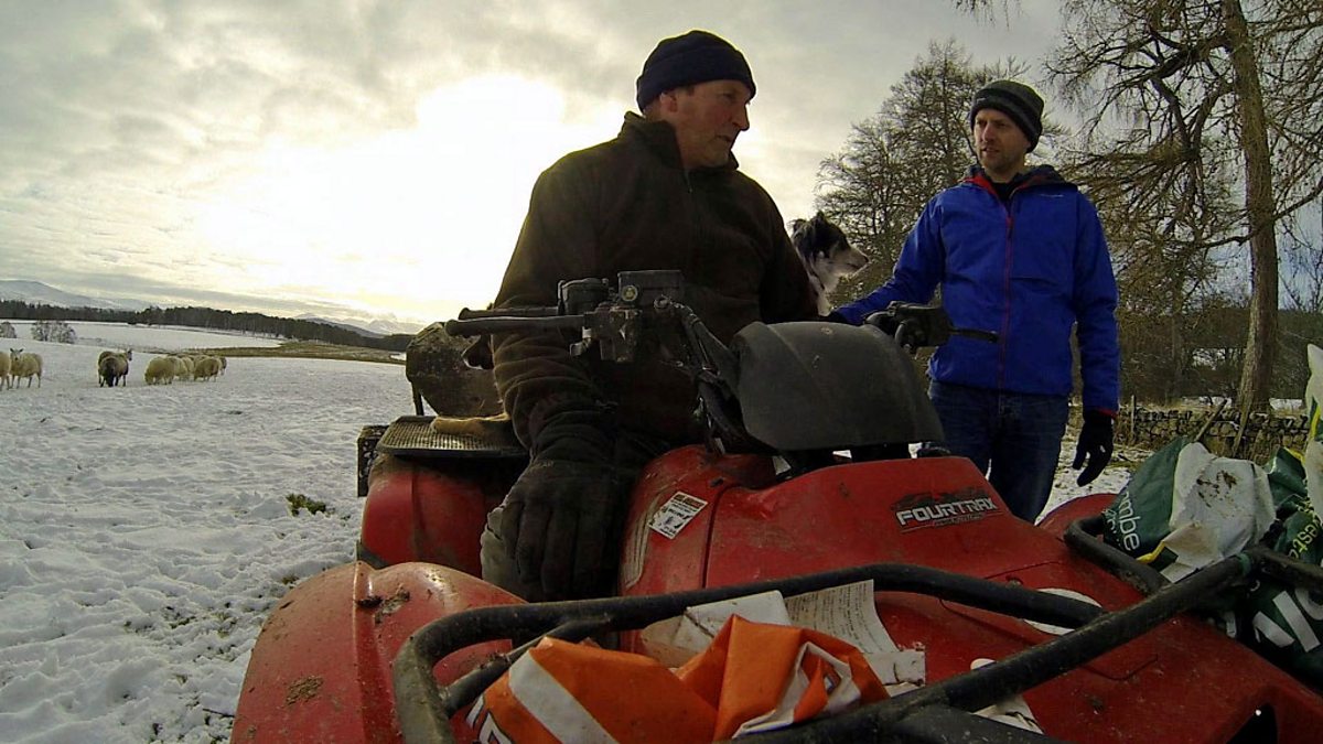 1/4Tha Donaidh MacAoidh a-muigh anns an stoirm. Donnie Mackay braves our stormy weather.