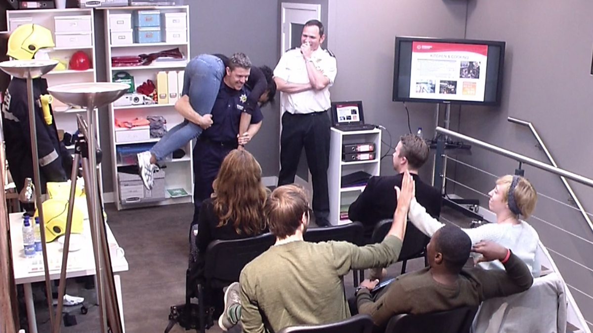 Unexpected Star Andy gives a fireman's lift to one of the 'fire safety course attendees' in this week's prank room.