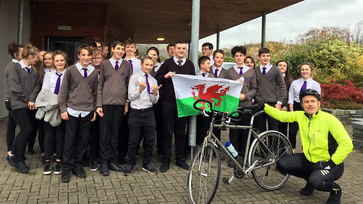 Ysgolion o Lanilar i Dywyn yn cefnogi Aled ar ei daith er budd BBC Plant Mewn Angen.