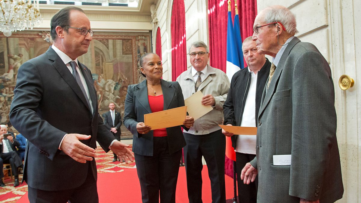 Photo: French President Francois Hollande welcomes former striker Norbert Gilmez during a ceremony at the Elysee Palace in Paris in September 2016. Credit: Reuters.