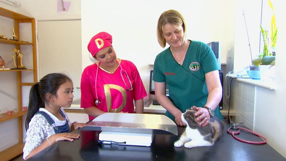 Mae Dona'n mynd i weithio mewn milfeddygfa gyda Llinos. Come and join Dona Direidi as she tries her hand at all sorts of different jobs. Today she's going to work as a vet with Llinos.