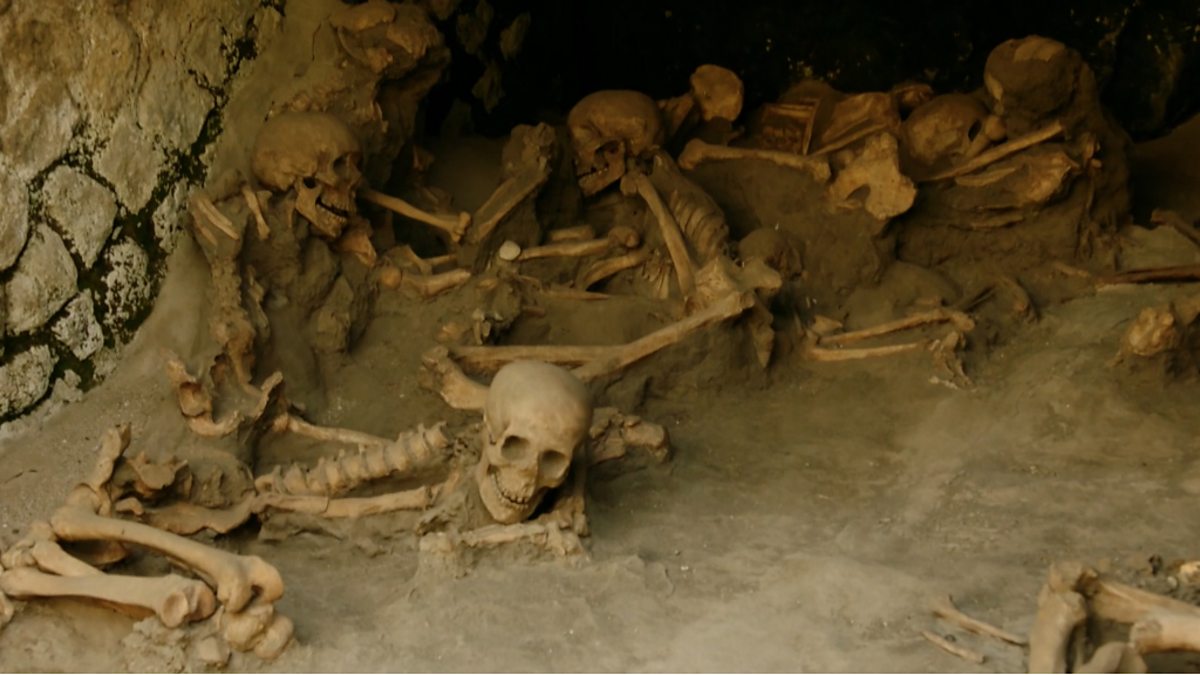 Professor Andrew Wallace-Hadrill shows Alexander how the pyroclastic flow from the Vesuvius eruption killed its victims in Herculaneum in 79AD.