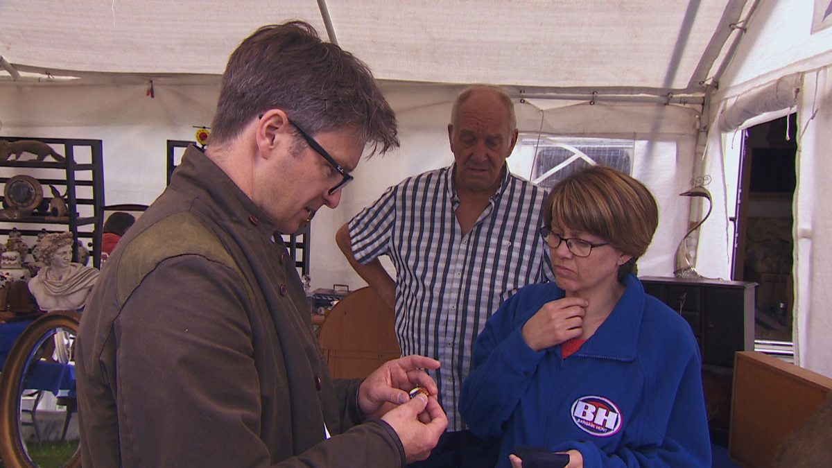 The blue team, Justin and Jane have found a rare Royal Doulton brooch.