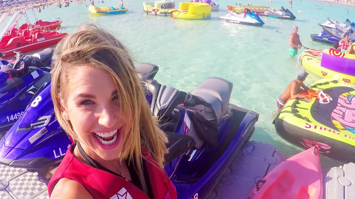 Vogue Williams holds on for dear life on a Stingray in Ayia Napa.
