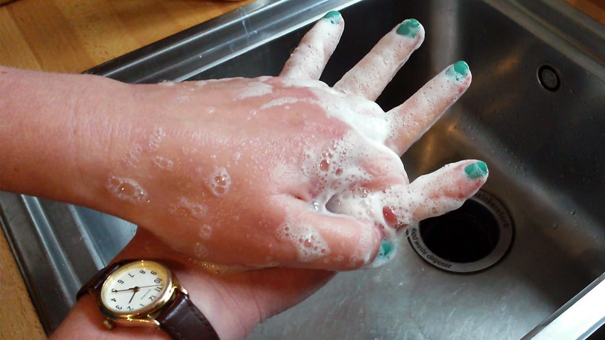 Hygiene expert Professor Sally Bloomfield shows presenter Marnie Chesterton how to wash her hands like a nurse