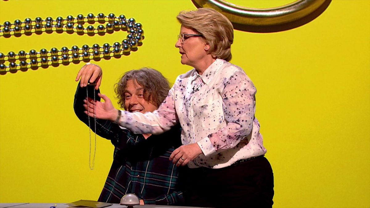 Sandi demonstrates the ring-dropping trick. Some of the panelists need more assistance than others.