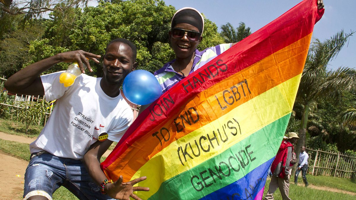 (Photo: Ugandan men hold a rainbow flag reading "Join hands to end LGBTI (Lesbian Gay Bi Trans Intersex - called Kuchu in Uganda) genocide" as they celebrate on August 9, 2014 during the annual gay pride in Entebbe, Uganda. Getty Images)