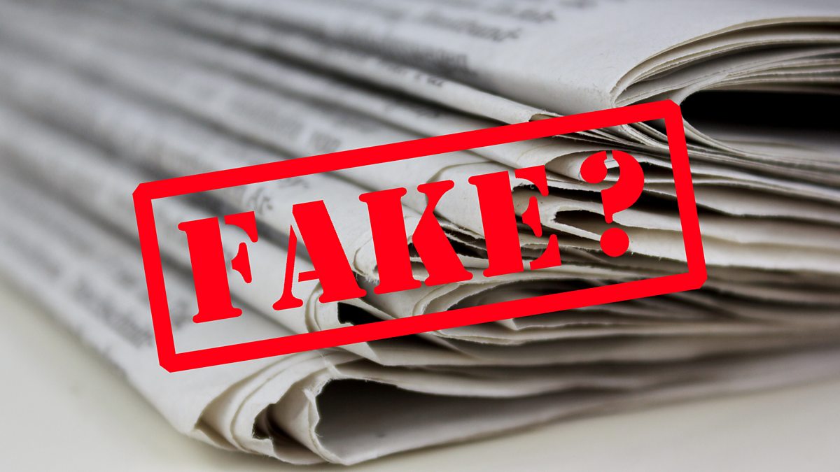 (Image: A stack of newspapers branded with a red ‘fake’ stamp. Credit: Thinkstock; BBC.)