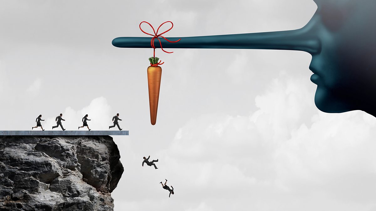 (Image: A long-nosed figure with a carrot dangling off the end leading people off a cliff. Credit: wildpixel/ Thinkstock)
