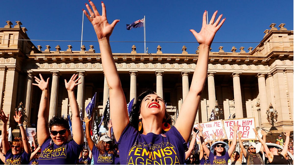 Picture: Women raising their hands to the sky at an International Women's Day event in Australia