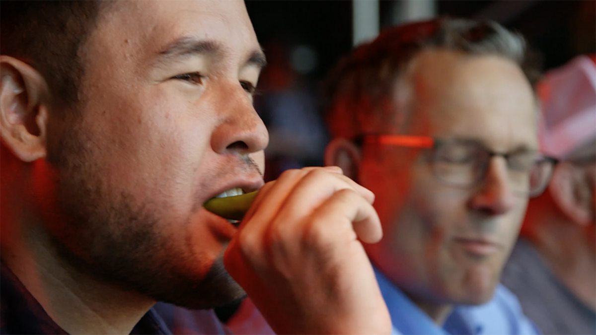 James Wong and Michael Mosley takes part in a chilli eating contest to see who can put up with most most pain from their food.