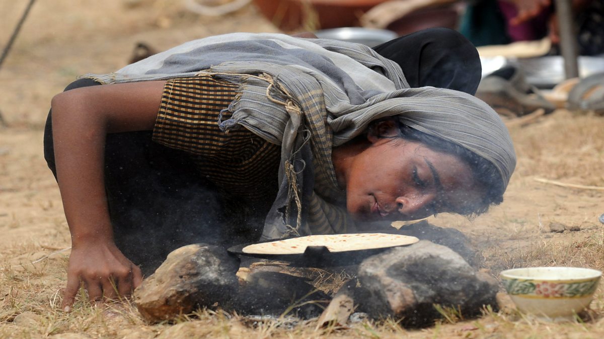 (Image: A Pakistani woman blows on a small cooking fire to bake bread at a makeshift camp. Credit: Rizwan Tabassum/ Getty Images)