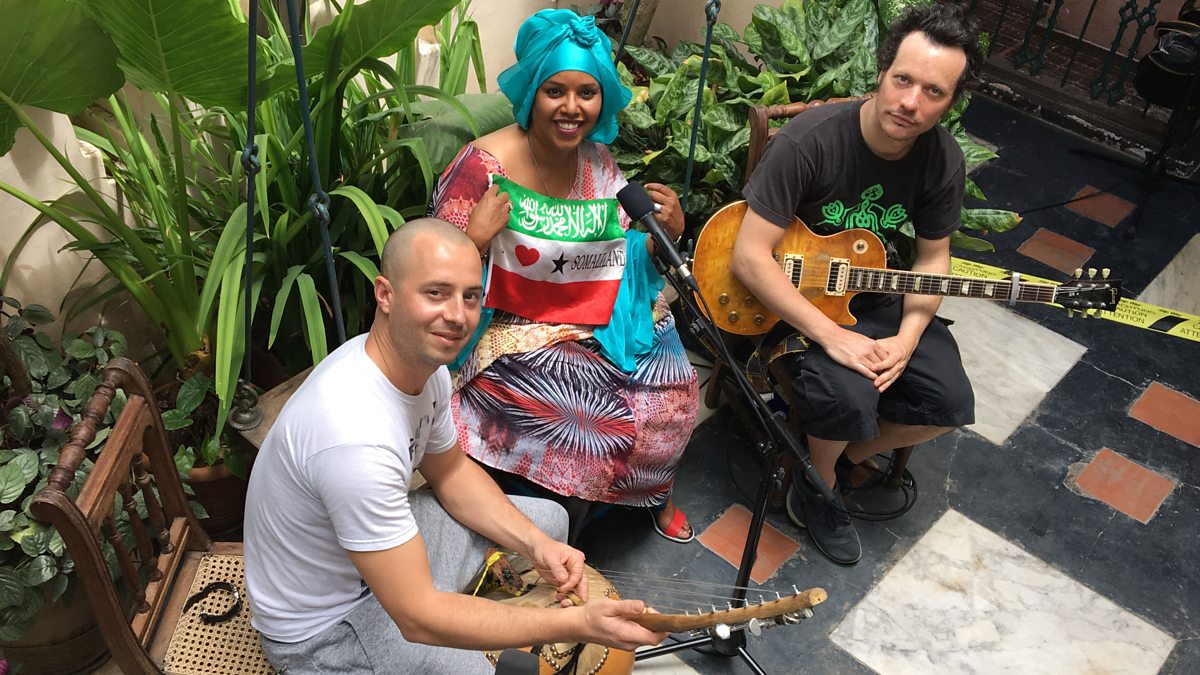The Sahra Halgan Trio perform for BBC Global Beats in Zanzibar. Sahra Halgan is passionate about her homeland, and has recently returned to Hargeisa, having spent many years in France. She has set up a cultural centre to try to revive arts and crafts lost during the civil war. The centre also hosts live music events. The music she makes with her trio combines the songs of Somaliland with Malian and rock influences.