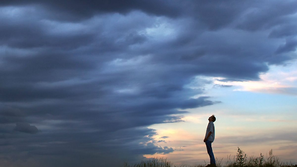 (Image: Man looking up to grey clouds. Credit: Thinkstock)