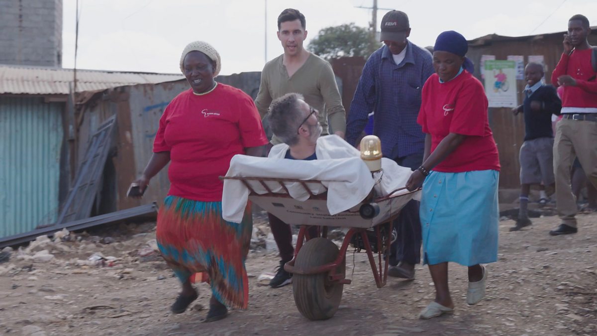 David Baddiel is rushed to hospital in a wheelbarrow ambulance.