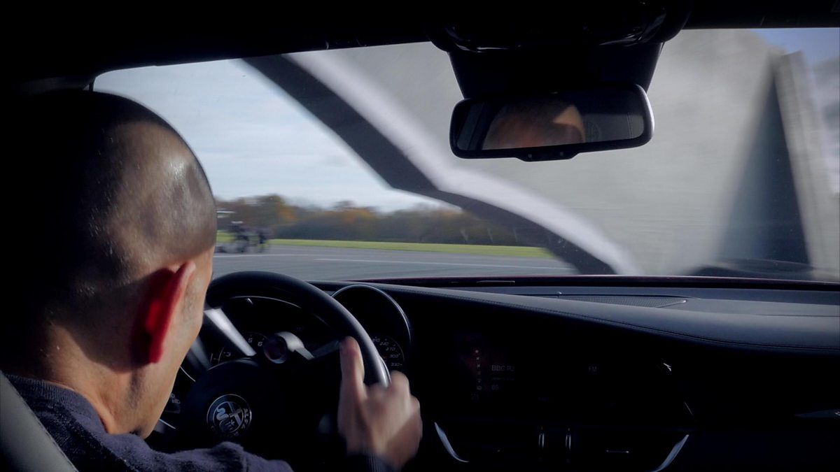 Chris Harris tries to drift the Alfa Romeo Giulia QV through a car shaped hole in the wall