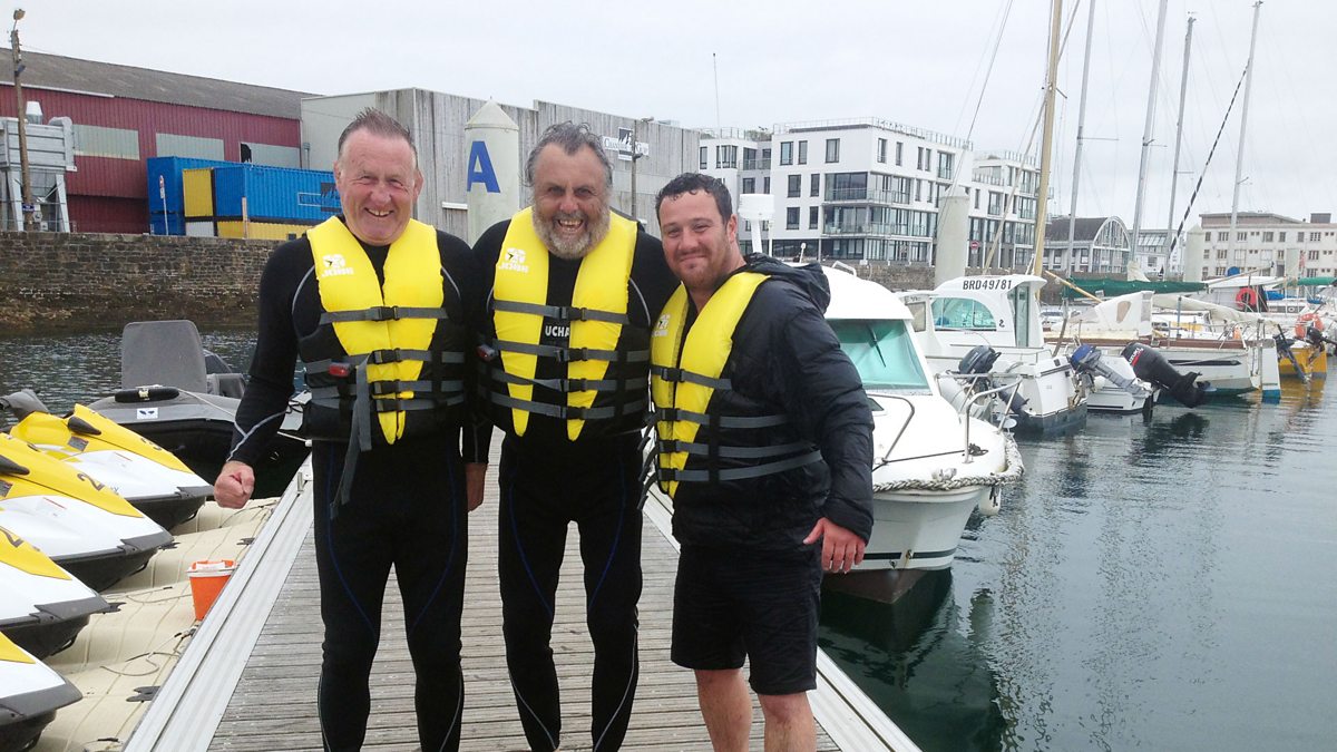 Jet skis a thaith i fyny Afon Elorn i Landerneau, tref ganoloesol wedi'i chefeillio â Chaernarfon. Beth fydd yn plesio pwy? Jet skiing or a leisurely sail - which sounds the better option?