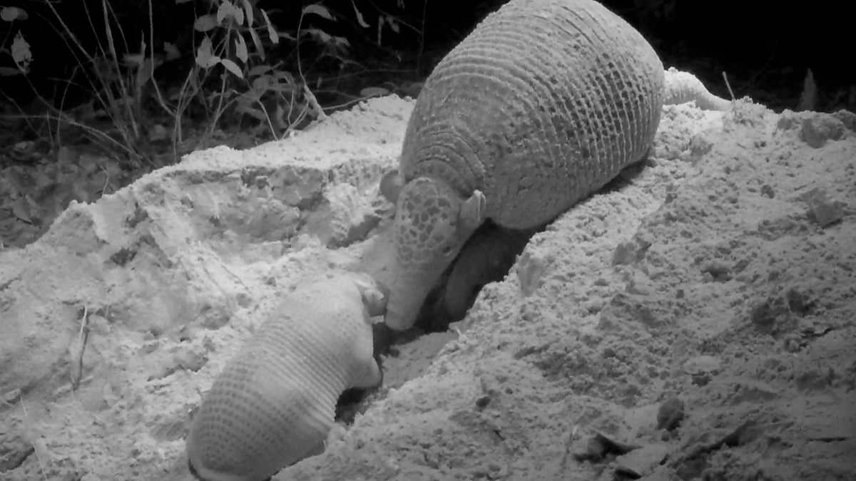 In a world first, footage is captured of a giant armadillo baby leaving its burrow.