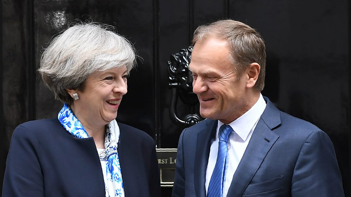 (IMAGE: British Prime Minister Theresa May (L) greets European Council President Donald Tusk outside 10 Downing street in central London on April 6 - JUSTIN TALLIS/AFP/Getty Images)