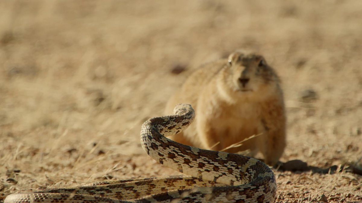 On the prairies of Northern Mexico, a male prairie dog bravely defends his newborn pups from a large bull snake.