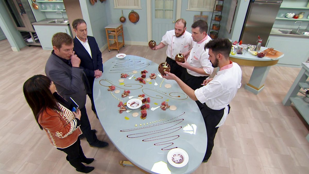 Laurian's team perform their live plating, thrilling the dessert-splattered judges.
