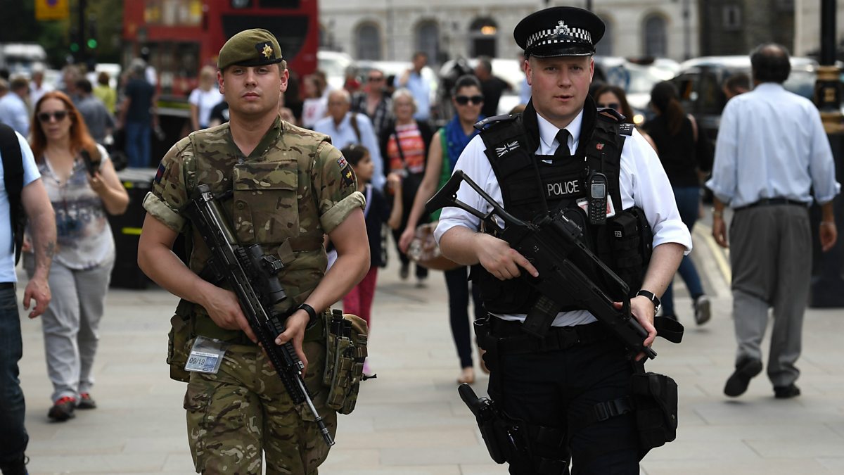 Photo: an armed policeman and a soldier patrol the streets of London, 24th May 2017. Credit: Getty Images