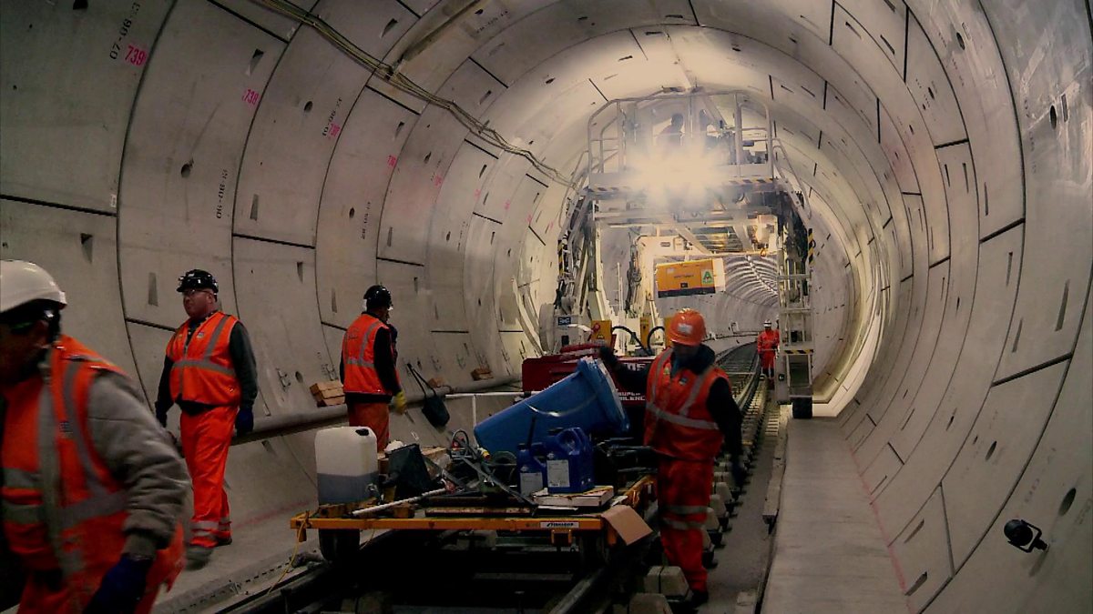 Engineers under London operate a 'transformer'-like machine to lay up to 600m of sleepers a day