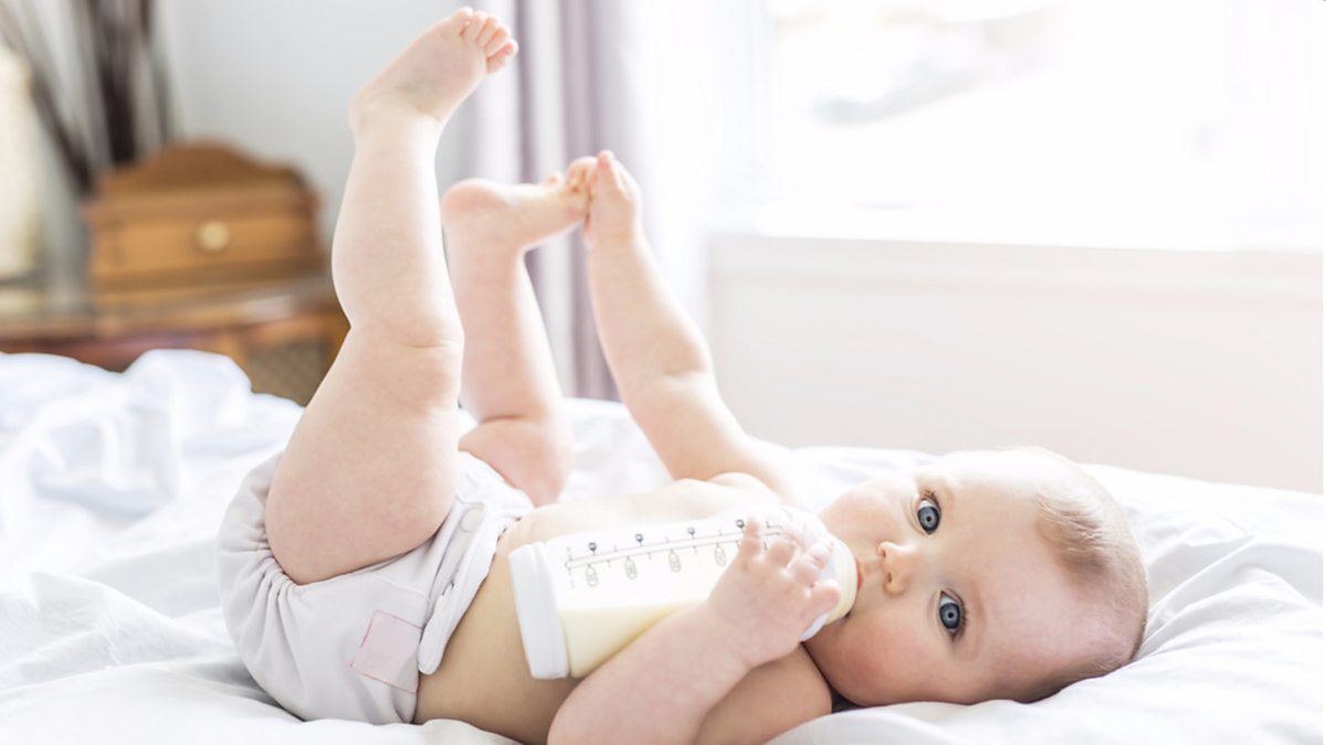 (Image: Baby lying down drinking from bottle, Credit: Lopolo/Shutterstock)