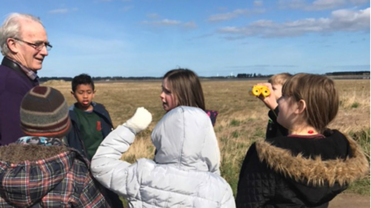 Roy Dennis and local children investigate the wildlife in Findhorn Bay