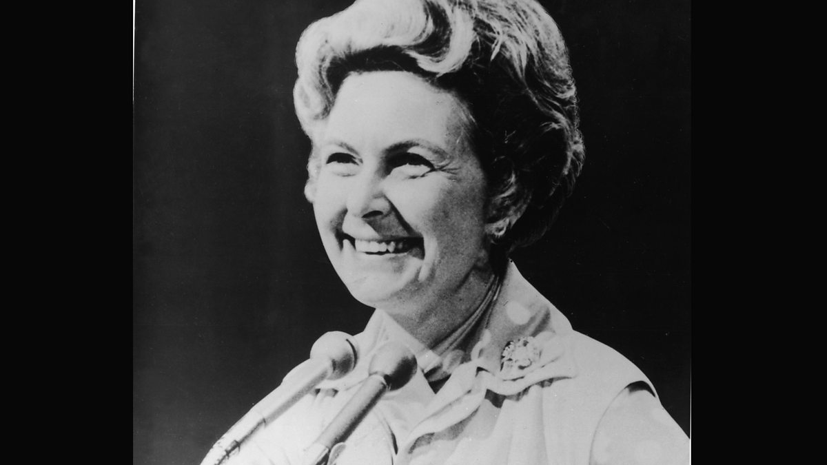 PHOTO: American political activist Phyllis Schlafly smiles from behind a pair of podium mounted microphones, 1982. (Photo by Hulton Archive/Getty Images)