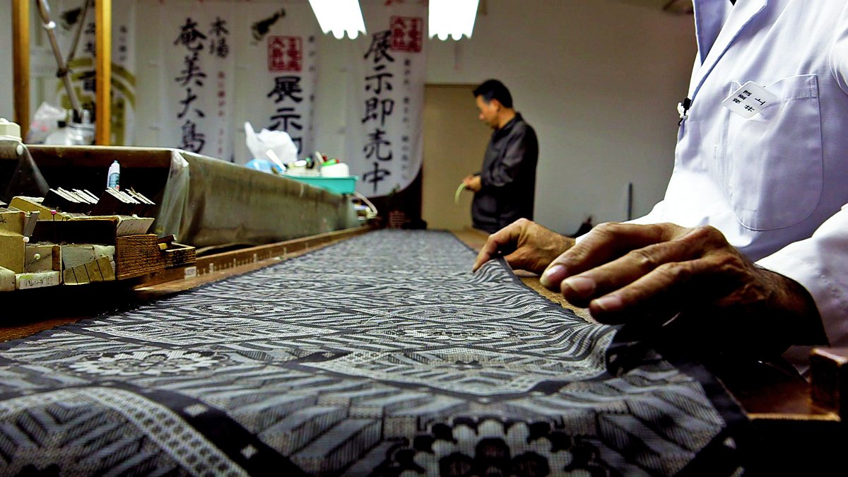 Isosuke Inoue checks that the finished silk meets the correct standard of weaving. He does this mainly by feel and amazingly he can identify individual weavers work by touch.