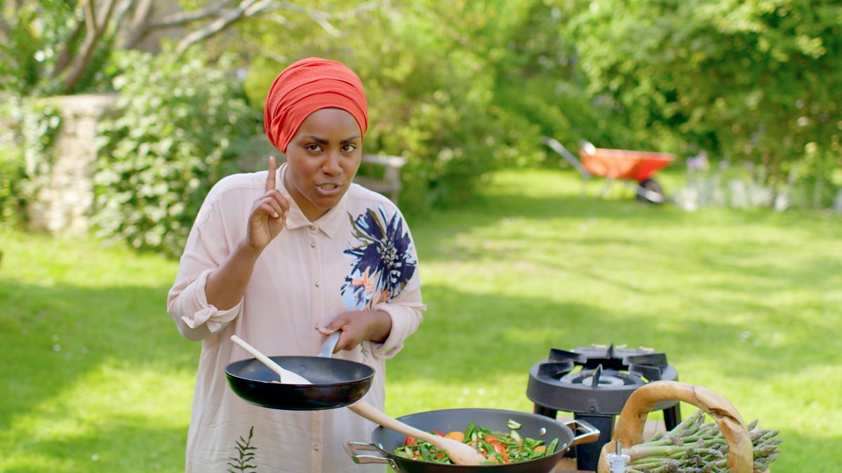 Nadiya fries garlic and spices separately before adding them to her stir fried vegetables.